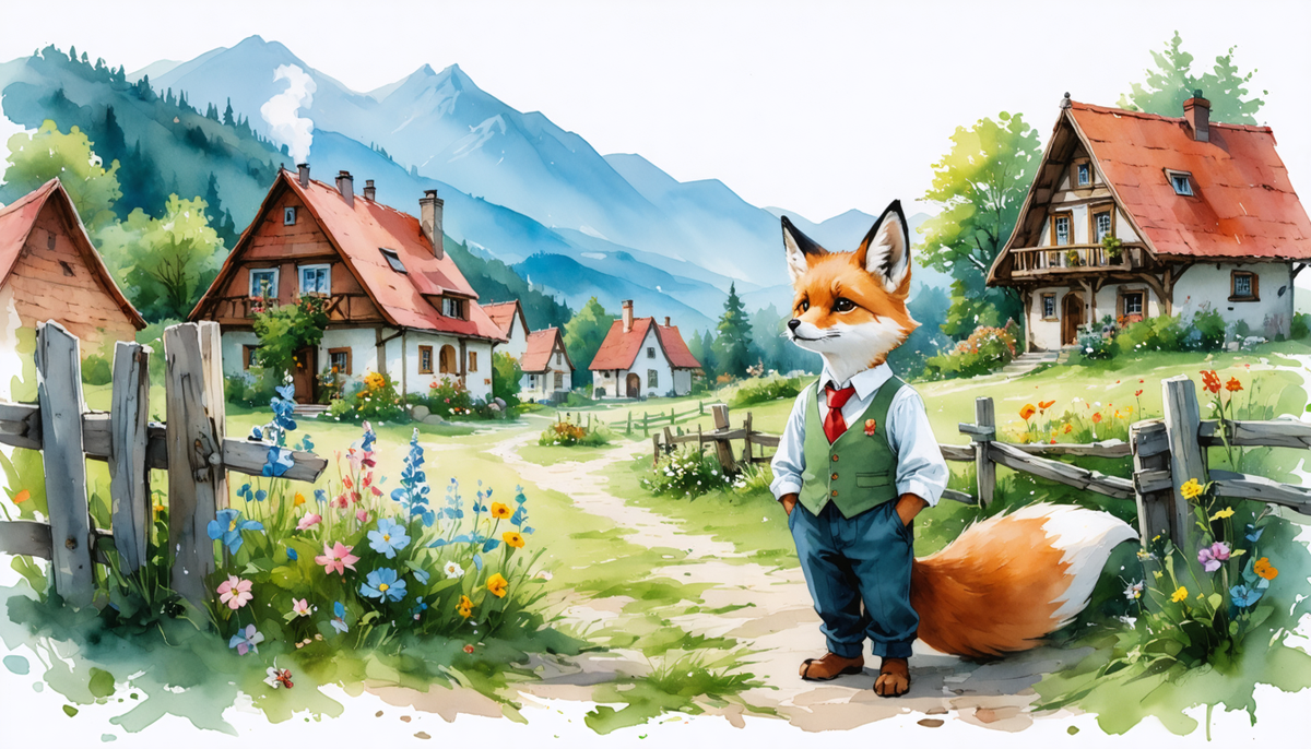 Знаете, иногда я забираюсь на самый высокий пригорок, сажусь на этот старый пень, что пахнет дождём и временем, и просто смотрю. Вот как на этой картинке. Видите, вон тот домик с рыжей крышей, почти такого же цвета, как моя шубка? Это мой домик. По утрам из трубы поднимается дымок, пахнущий сушёной мятой и печёными яблоками — это я завтракаю. А вечерами я люблю сидеть на крылечке и слушать, как деревня засыпает. Тропинка, что вьётся между холмами, — это главная улица. Она мягкая, как лапка, потому что её "мякают" лапками все жители. По утрам по ней бежит Ёж Архип — на почту за газетой, днём важно прогуливается Барсук Прокл — проверить, как растёт его морковка. А вечером она серебрится под луной, будто усыпанная алмазной пылью. А эти огоньки в окошках? Это не просто свет. Это тёплые, живые искорки. Каждая — как чьё-то приветствие. Вот мелькнул зелёный абажур у Совы Филимоны — она, наверное, читает новую книгу. А там, где светит жёлтый фонарик, — это у Крота Альфреда: он что-то мастерит
