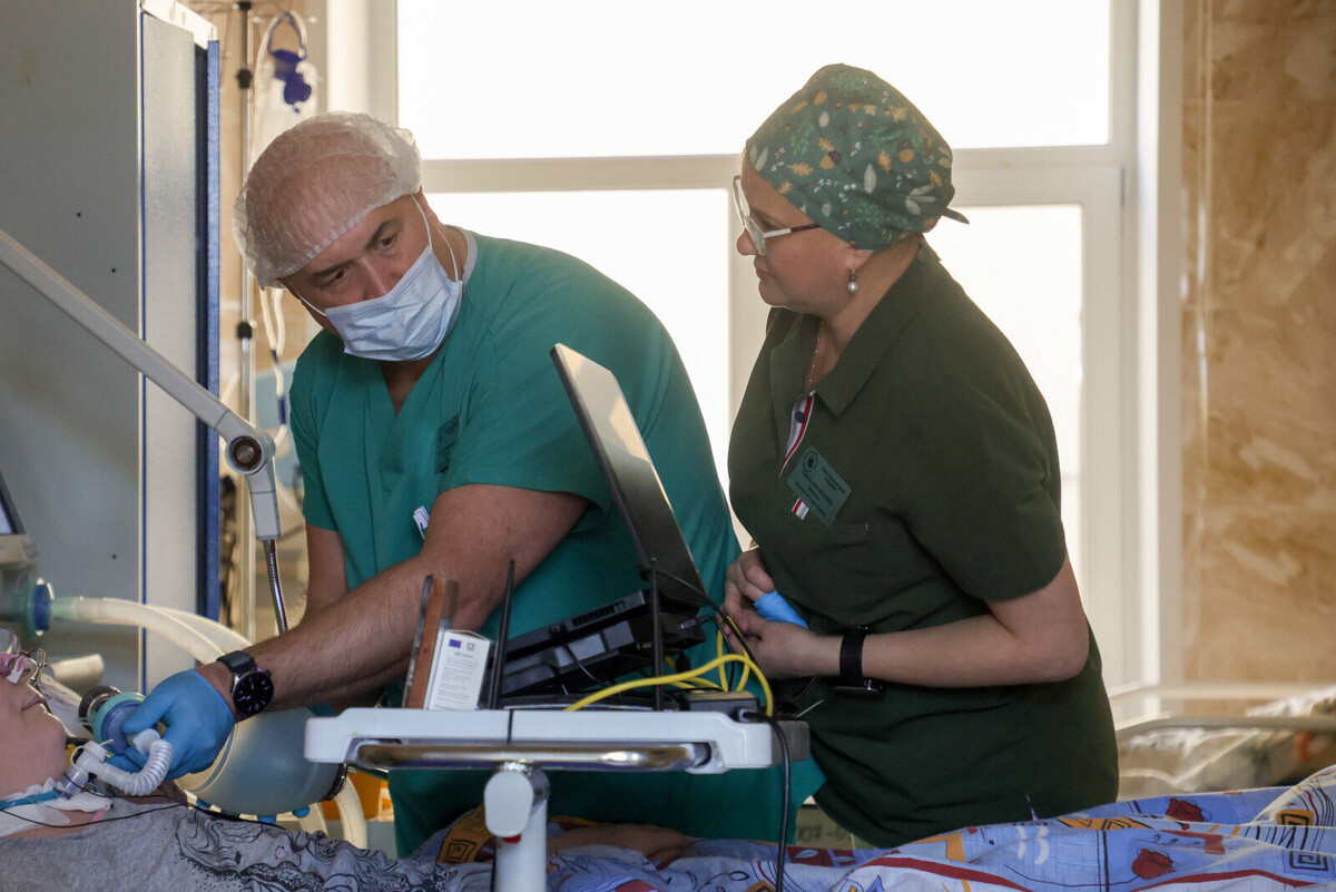 Эдуард Багаев, врач анестезиолог-реаниматолог, заведующий отделением выездной патронажной паллиативной медицинской помощи, показывает портативный аппарат ИВЛ, который выдают пациентам. После того, как родственников обучили, как пользоваться медоборудованием, и после стабилизации состояния пациентов можно выписать, они передаются на патронаж отделения выездной паллиативной помощи. Врач отделения согласовывает дату посещения с родственниками пациента, при необходимости проводит коррекцию оборудования, помогает решить все вопросы. Пациентам в безвозмездное пользование предоставляют, помимо ИВЛ, откашливатель, функциональную кровать с электроприводом, подъемник, медицинский отсасыватель для удаления мокроты из дыхательных путей, расходные материалы к оборудованию и энтеральное питание.