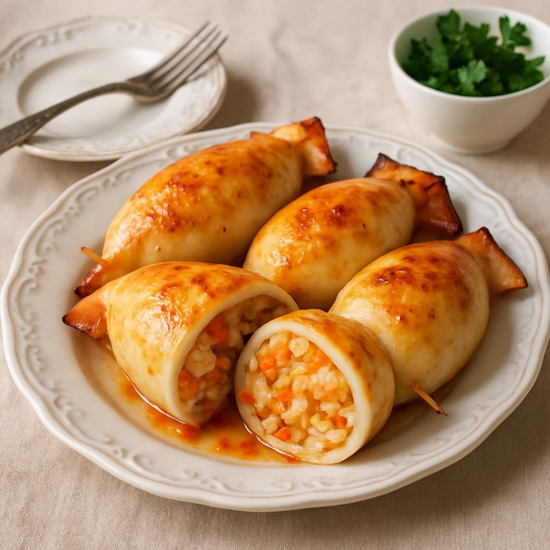 Фаршированные кальмары Ингредиенты ⤵️ 🔸 Кальмары – 4 шт. 🔸 Рис отварной – 200 г 🔸 Креветки очищенные – 150 г 🔸 Лук репчатый – 1 шт. 🔸 Морковь – 1 шт. 🔸 Чеснок – 2 зубчика 🔸 Сыр твердый – 100 г 🔸 Сметана – 3 ст.л. 🔸 Укроп свежий – 4 веточки 🔸 Соль – 1 ч.л. 🔸 Перец черный молотый – ½ ч.л. 🔸 Лимонный сок – 1 ст.л. 🔸 Оливковое масло – 2 ст.л. Приготовление 🦑 1. Кальмары очистить, сбрызнуть лимонным соком. 2. Лук и морковь нарезать кубиками, обжарить на масле до мягкости. 3. Добавить креветки, жарить 3 минуты. Снять с огня. 4. Смешать рис, обжаренные овощи с креветками, измельченный чеснок и укроп. 5. Посолить, поперчить. Нафаршировать тушки кальмаров. 6. Противень смазать маслом. Выложить кальмары, смазать сметаной. 7. Запекать 15-20 минут при 180°C. 8. За 5 минут до готовности посыпать тертым сыром. 9. Подавать с дольками лимона. Рецепт дня #фаршированные_кальмары #кальмары #креветки #морепродукты #рис #сыр #овощи #ужин