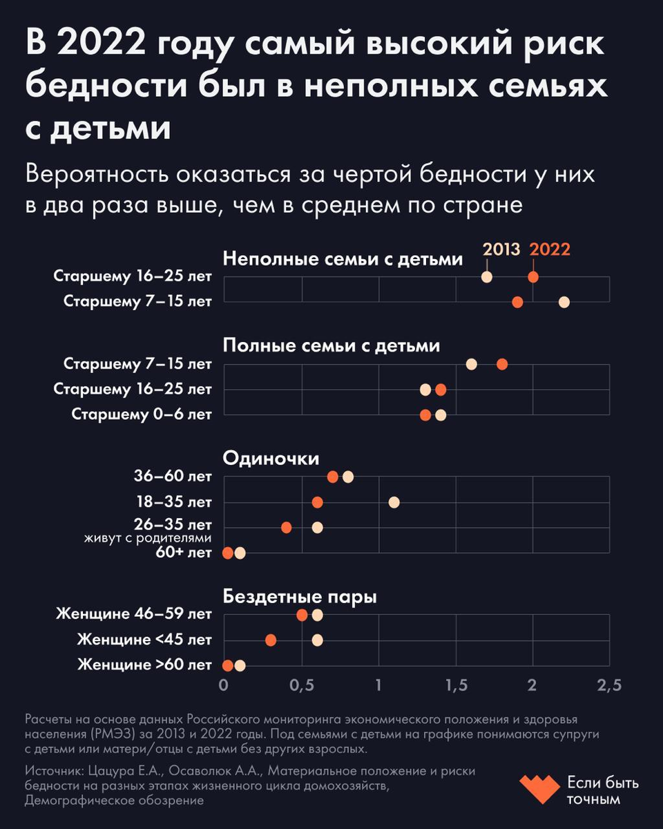 За десятилетие общий уровень бедности в России почти не изменился. Однако за этой внешней стабильностью скрылись заметные сдвиги в распределении бедности между разными типами семей. Об этом исследование Елены Цацуры и Александры Осаволюк из РАНХиГС. 🔸Самыми уязвимыми оказались семьи с детьми школьного возраста — когда старшему ребенку от 7 до 15 лет. В 2022 году их риск бедности составил 1,8, то есть вероятность оказаться за чертой бедности у таких семей почти вдвое выше, чем в среднем по стране. 🔸Для домохозяйств с маленькими детьми (до шести лет) этот показатель ниже — около 1,3, но даже в этих семьях среднедушевые доходы примерно на 37 % меньше, чем у молодых бездетных пар. 🔸У неполных семей вероятность оказаться за чертой бедности оказалась в два раза выше, чем в среднем по стране — и это не зависит от возраста ребенка. Одинокие родители остаются самой уязвимой категорией, несмотря на адресные меры поддержки. 🔸У пожилых пар и одиноких пенсионеров риска бедности практически нет,