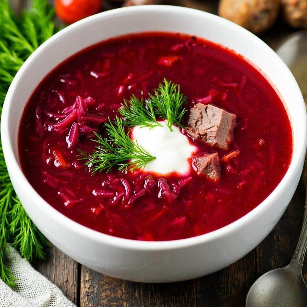 Борщ — одно из самых известных традиционных русских блюд, которое полюбилось многим благодаря своему насыщенному вкусу и богатству ароматов. Это первое блюдо является настоящим символом русской кухни и отличается богатым вкусом, ярким цветом и ароматом. Ингредиенты Для приготовления классического борща вам понадобятся следующие ингредиенты: - Свежая капуста белокочанная — 200 граммов - Картофель свежий — 2-3 штуки среднего размера - Морковь свежая — 1 крупная штучка - Свёкла красная — 1 средняя свёкла - Репчатый лук — 1 головка - Мясо на кости (говяжья голень или ребрышки) — около 500 грамм - Томатная паста или свежие помидоры — 2 столовые ложки пасты или пара свежих спелых томатов - Уксус столовый — чайная ложка - Чеснок — пару зубчиков - Специи и зелень: лавровый лист, черный перец горошком, соль, петрушка, укроп - Вода чистая питьевая — примерно 2 литра - Подсолнечное масло рафинированное — для пассировки овощей Шаги приготовления Этап 1. Варим мясной бульон 1. Промойте мяс