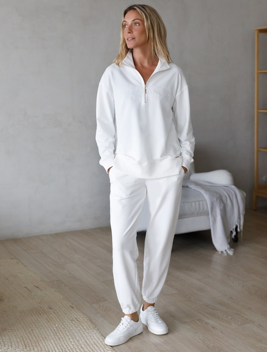Отличный вариант для ценительниц стиля спорт-шик — это универсальные костюмы из премиального футера, которые идеально сочетают уют, современность и практичность. Минималистичный джемпер с вышивкой “Vintage collection cotton club” и удобным воротом на молнии станет незаменимой основой гардероба в прохладную погоду — мягкая текстура дарит ощущение комфорта, а материал с добавлением эластана устойчиво держит форму даже после многочисленных стирок. Свободный крой не сковывает движения и подходит для активных будней — будь то прогулка, отдых или встреча с друзьями. Универсальный дизайн прекрасно смотрится на любой фигуре, а широкий размерный ряд, включая большие размеры, позволяет подобрать идеальную посадку. Стиль спорт-шик позволяет выглядеть современно и динамично, сохраняя при этом ощущение домашнего уюта. Такой лук легко дополнить парой белых кроссовок или стильной базовой сумкой для завершения образа. Естественные оттенки — будь то белый, черный или модный кофейный — универсальны