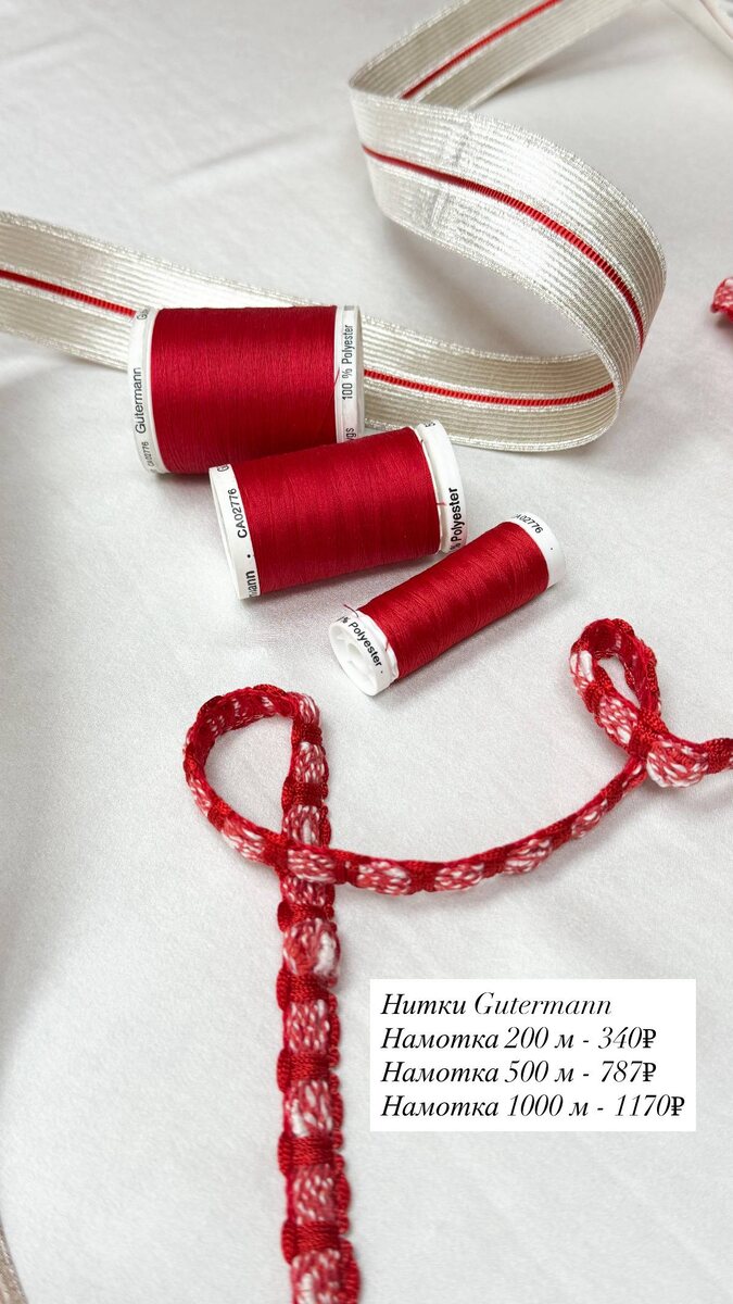 Нитки Gutermann в ассортименте. Красная тесьма: Ширина: 1см Стоимость: 490р/м Металлизированная тесьма: Ширина: 3,2 см Стоимость: 468р/м На первый заказ мы дарим Вам скидку 10% Для заказа пишите пожалуйста нам в телеграмм с волшебной фразой «Пришла из Дзен» Ссылка на наш телеграмм канал: Ждём Вас ежедневно, с 10:00 до 20:00 По адресу: г.Москва, ул.Мневники д.6, п.6