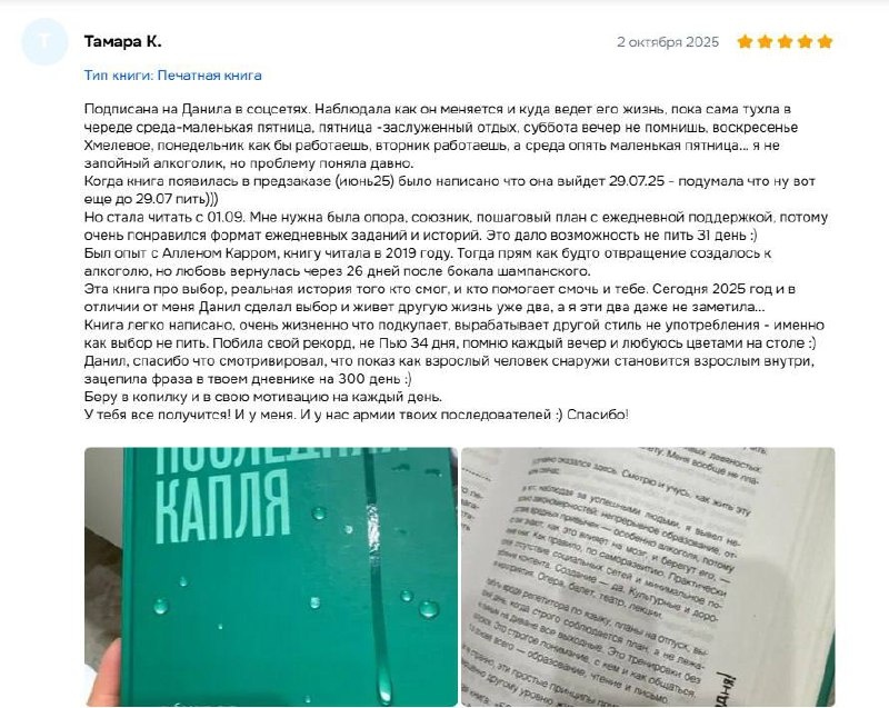 Подписана на Данила в соцсетях. Наблюдала как он меняется и куда ведет его жизнь, пока сама тухла в череде среда - маленькая пятница, пятница - заслуженный отдых, суббота вечер не помнишь, воскресенье. Хмелевое, понедельник как бы работаешь, вторник работаешь, а среда опять маленькая пятница... я не запойный алкоголик, но проблему поняла давно. Когда книга появилась в предзаказе (июнь25) было написано что она выйдет 29.07.25 - подумала что ну вот еще до 29.07 пить))) Но стала читать с 01.09. Мне нужна была опора, союзник, пошаговый план с ежедневной поддержкой, потому очень понравился формат ежедневных заданий и историй. Это дало возможность не пить 31 день :) Был опыт с Алленом Карром, книгу читала в 2019 году. Тогда прям как будто отвращение создалось к алкоголю, но любовь вернулась через 26 дней после бокала шампанского. Эта книга про выбор, реальная история того кто смог, и кто помогает смочь и тебе. Сегодня 2025 год и в отличии от меня Данил сделал выбор и живет другую жизнь у