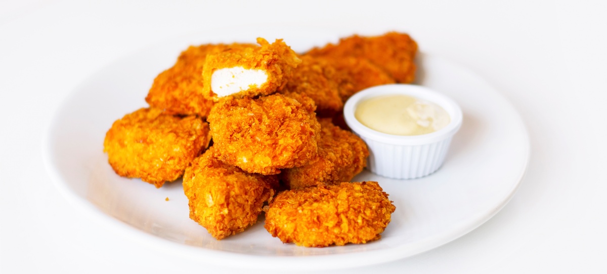 Готовые наггетсы были похожи на маленькие, неправильной формы пончики. Их поверхность, покрытая пузырьками и кратерами, так и манила разломить ее. Мы не удержались. Взяли еще горячий, почти обжигающий кусочек, макнули его в соус — мы приготовили заранее сливочно-чесночный и томатный — и откусили.