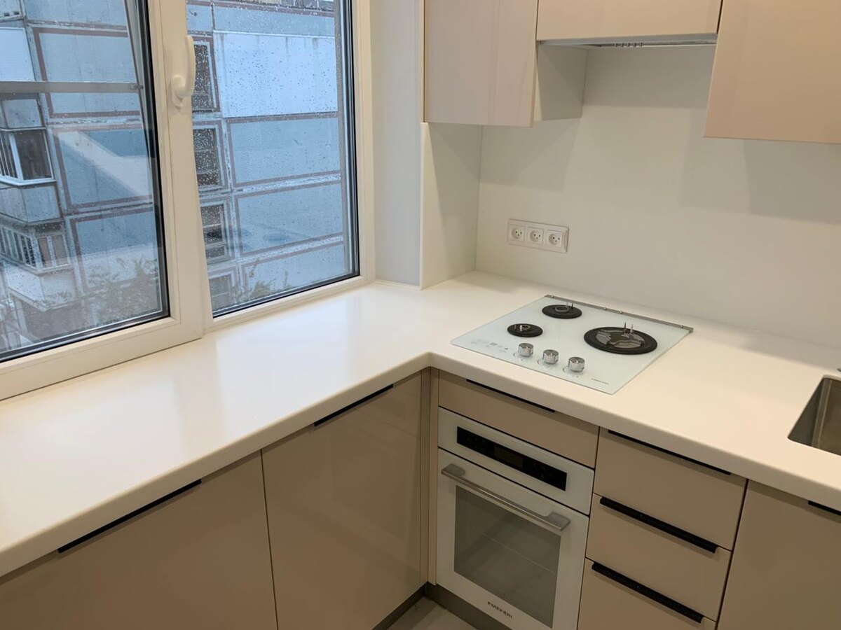 Для компактных помещений оптимален минималистичный дизайн с функциональной организацией. Акриловая столешница, переходящая в подоконник, создаёт иллюзию простора и визуально увеличивает площадь помещения.