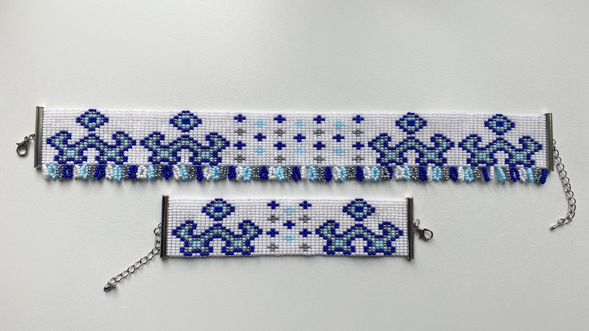 На первом фото Вы видите комплект из бисера, который я недавно сделала на станке. И мне показалось, что процесс его создания был достаточно интересен, чтобы написать здесь статью:). Я редко работаю с бисером и мой навыки в этом не очень высоки, но очень люблю вязать жгуты крючком. Моя подруга спросила, смогу ли я сделать ей чокер и скинула в качестве референса фото из запрещенной социальной сети. Картинка очень размытая. По ней я увидела только, что чокер сделан на станке для бисера (я на таком еще ни разу не работала, но очень хотела попробовать), и что помимо крестиков в середине и бахромы по бокам есть какой-то орнамент. От "оригинала" мы решили оставить примерный размер, крестики и бахрому. Орнамент решили тоже сделать, но другой. Выбрали "сосновую шишку". Я купила себе станок и сделала на нем для себя браслет в качестве практики (пост с этим браслетом я уже выкладывала здесь). Мы определились с цветовой гаммой - цветов должно было быть четыре: белый, синий, голубо