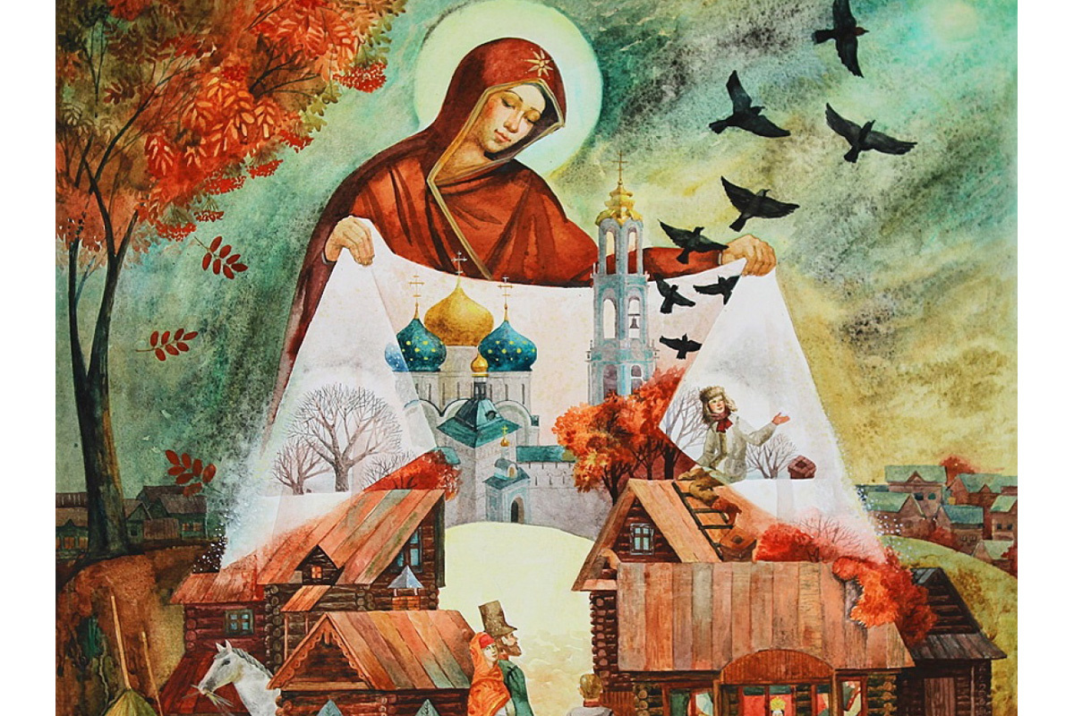 Осенний ветер кружится у храма, Листва ложится золотом к ногам. А в небесах, над тучами упрямо, Сияет плат Пречистой Мариам. И было чудо в древнем граде, Когда гроза нависла над страной. Собрались люди, как один, все в храме И попросили Божьей помощи святой. Господь услышал скорбные молитвы. На помощь людям посылает Мать. Сильнее нет у нас защиты, В ее руках сияет благодать. Она пришла - рассыпалось все войско, Накрыло корабли огромною волной. Враги увидели военное искусство, Творимое незримою рукой. Пусть мир шумит, пусть суетно теченье, Но над душой — прохлада и покой. Ты принесла нам радость утешенья Своею ризой, лёгкой, как парчой. Простри же свой Покров над каждой крышей, Над сирым, слабым, над больной душой. Чтоб каждый в сердце благодать услышал, В тени любви Твоей, такой большой.