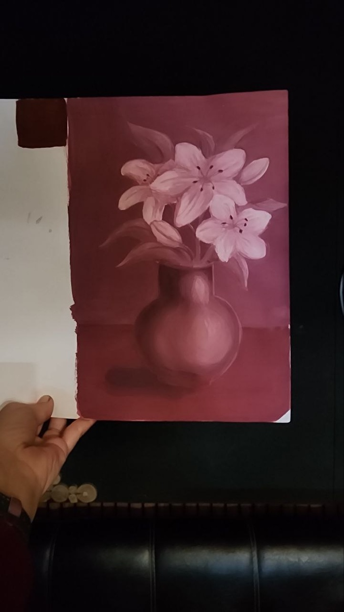 Иногда чтобы увидеть всю палитру чувств, достаточно одного цвета. ✨ Знакомьтесь, это — монохром. Если объяснять на пальцах, то это как смотреть старый добрый фильм: картинка чёрно-белая, но эмоции — все цвета радуги. Вот и в рисовании то же самое: берёшь один-единственный цвет и рисуешь им всё на свете, играя лишь его оттенками, тенью и светом. Моя дочь для своей монохромной работы в художке выбрала роскошный бордо. И перед нами расцвела вот такая нежная ваза с лилиями! Один цвет,а сколько в этой работе глубины, объёма и характера! Видите, как где-то бордо гуще и темнее, а где-то — это лёгкий, воздушный намёк на лепесток? Я в полном восторге. Кажется, мы обе сегодня поняли, что настоящее волшебство скрыто не в количестве красок, а в умении видеть оттенки там, где другие видят лишь один цвет. #монохром #рисунокдочки #детитворят #первыешедевры #лилии #бордо #простоеволшебство #гордостьмамы