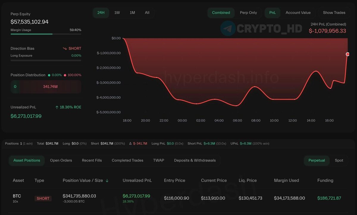 😳 Bitcoin OG увеличил шорт по BTC с 10х плечом до $341,000,000+ – завел еще $40,000,000 в качестве маржи на Hyperliquid