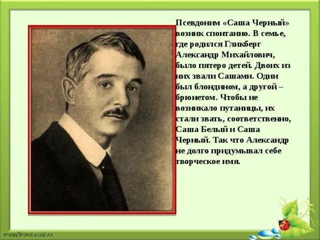 Любопытно, что юмор у Саши Чёрного проявился еще в юношестве. Ну кто еще придумал бы такой забавный и оригинальный литературный псевдоним "Сам-по-себе"? ) А еще, именно Корней Чуковский предрек его успех именно как детского писателя. И правда, есть в его произведениях какая-то особенная изюминка.