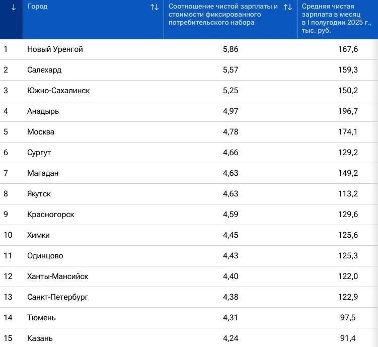 Города Ямала возглавили рейтинг городов России по уровню зарплат Административный центр ЯНАО Салехард и крупнейший город региона Новый Уренгой возглавили рейтинг российских городов по уровню зарплат. Средняя зарплата в Новом Уренгое за отчетный период составила 167,6 тысячи рублей (+7,3% за год). В Салехарде этот же показатель был на уровне 159,3 тысячи рублей при годовом росте 11,6%. Новоуренгойцы на одну зарплату могли приобрести в среднем 5,86 фиксированного потребительского набора, жители Салехарда — 5,57. Замыкают пятерку городов — лидеров по зарплатам Южно-Сахалинск, Анадырь и Москва.