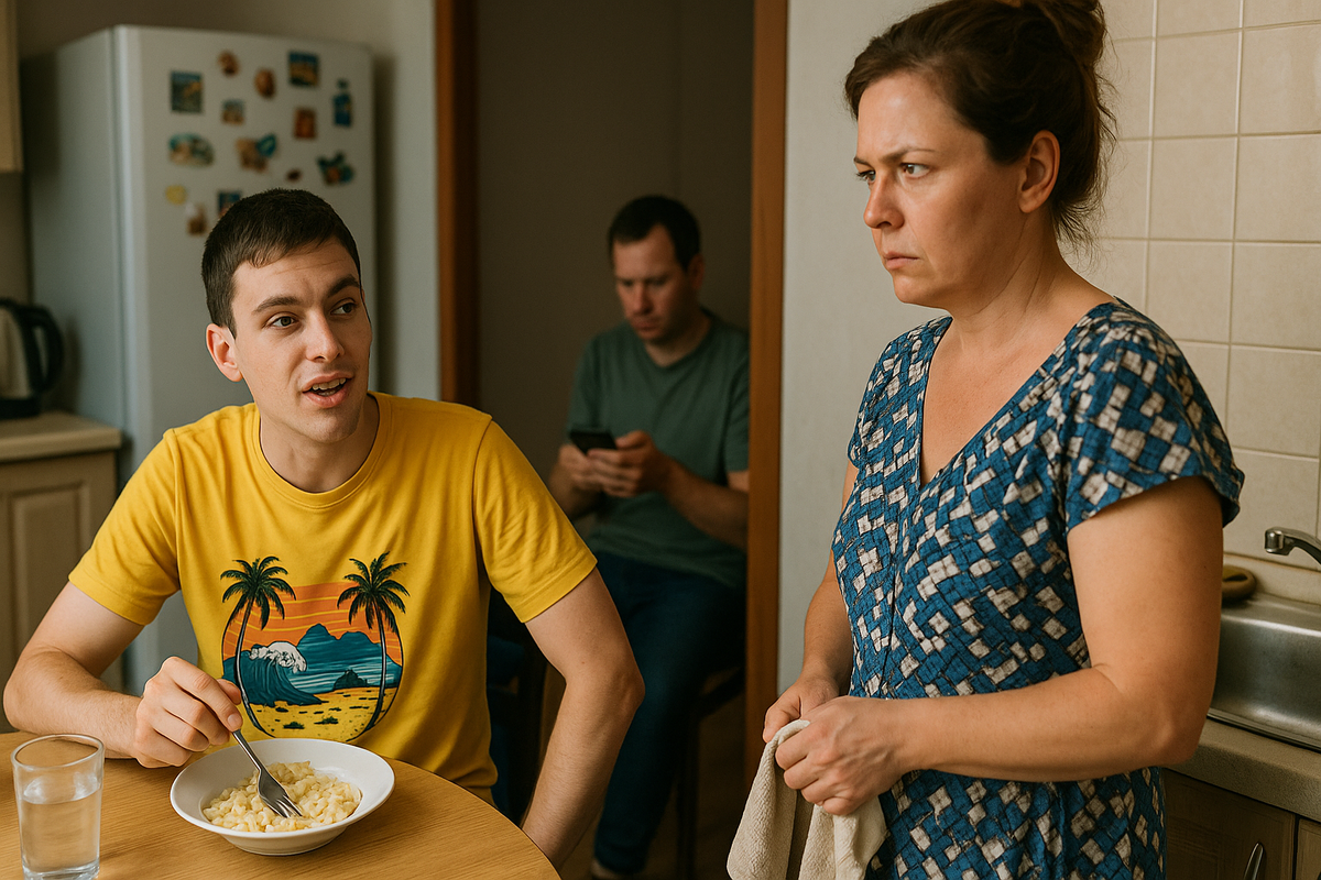 Наталья проснулась рано, как обычно. Денис ещё спал. Она тихо встала, накинула халат и вышла на кухню. Там уже сидел Егор. Парень ел остатки вчерашнего салата прямо из миски, стоя у холодильника. Когда Наталья вошла, он даже не поздоровался.
