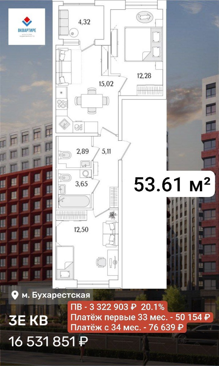 📌 Кейс 3Е-КВ, Фрунзенский р-н 🏠 🏃♂ Бухарестская, 15 минут пешком ☕️ 💸 Расчёт стоимости по семейной ипотеке от застройщика: Стоимость квартиры - 16 531 851 ₽ 🔥 ПВ - 3 322 903 ₽ (20.1%) ✅ Платёж первые 33 мес. - 50 154 ₽ 🚗 Платёж с 34 мес. - 76 639 ₽ 🎯 Ставка вначале - 2,2% 👍 Действует мес. - 33 📆 Ставка далее - 6% 🔄 Срок, лет - 30 🌐 ✨ Описание объекта: Это многогранный дом, где раскрываются все оттенки счастливой и яркой жизни. Живите так, словно каждый день — драгоценность. Авторская архитектура, зелёные и закрытые дворы, уютные общественные пространства — здесь есть всё, чтобы наполнить каждый день комфортом и эстетикой. 🏡 Жилой комплекс расположен во Фрунзенском районе, у станции метро «Бухарестская». Местоположение обладает уникальным балансом транспортной доступности — отсюда легко доехать и в центральную часть города, и в окраинные районы. Можно без пересадок на наземном транспорте за 20 минут добраться до Невского проспекта или на личном автомобиле до аэропорта Пу