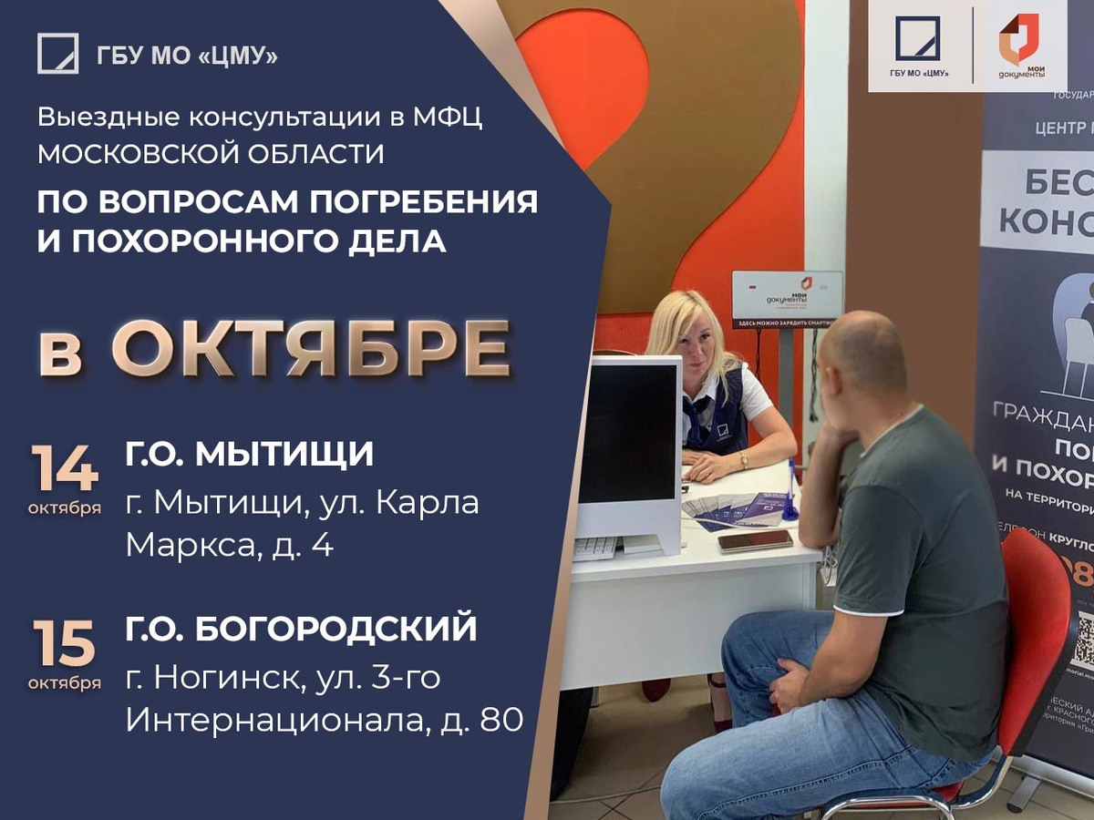 Уважаемые жители г. Мытищи и г. Ногинск. Приходите в МФЦ вашего города на выездные консультации экспертов по вопросам в сфере погребения и похоронного дела, которые состоятся: 14.10.2025 МФЦ, Московская обл., г.о. Мытищи, г. Мытищи,