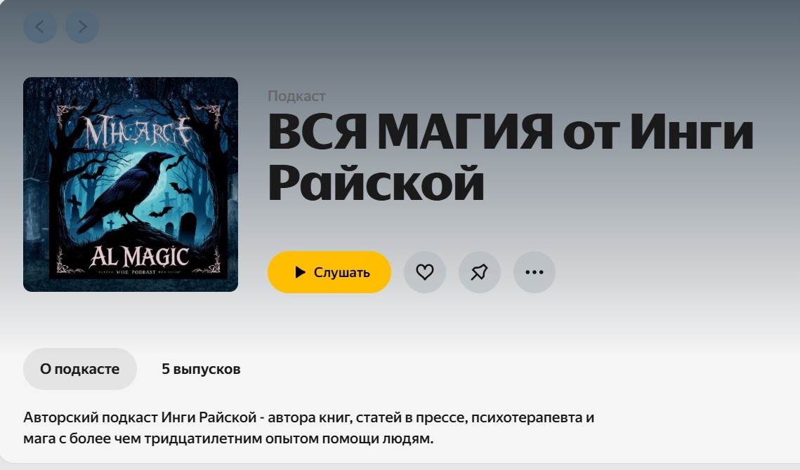 Если Вы любите Магию и интересуетесь эзотерикой, Вам будут интересны мои передачи в аудио формате на Яндекс Музыке. Мой опыт работы Мага и психотерапевта - источник самых разных историй помощи клиентам. Нет такого вопроса, с которым не обращались ко мне, и про всё это я постепенно рассажу Вам в своих передачах. Выпуски о Теории Магии и Эзотерики будут интересны тем. кто ищет Путь самореализации в этой области. Практические советы - тем, кто хочет защитить себя и своих близких от энергетических атак, найти путь к получению той или иной помощи, решить какую-то свою проблему, найти любовь, создать семью, заработать деньги и так далее... ✨ Магия отношений - развивает любовный ресурс 💰 Финансовая магия - формирует денежный канал 🧛 Энерговампиризм: крадники, привязки, подселения - защитит от атак вампиров 🎃 Магическое нападение и защита от него - даст новую степень Защиты 💲 Бизнес магия - поспособствуют развитию бизнеса и способностей к нему, 🧚 О саморазвитии - откроют дороги к самореа