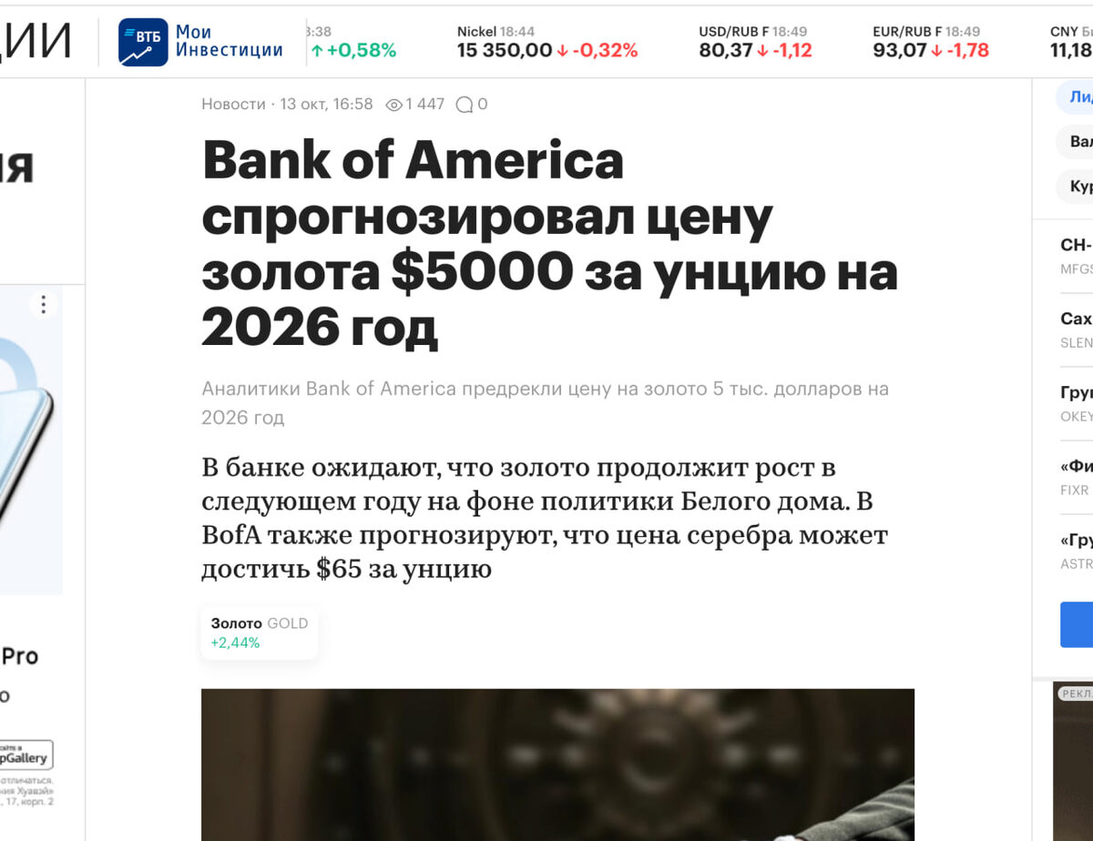 Когда Bank of America размахивает цифрами, у них не открылось окно в будущее — у них открылся квартальный отчёт. Им нужно, чтобы кто-то поверил и купил. Всё просто: “создай хайп — продай на пике”. Золото растёт не потому, что стало “редче” или “дороже”, а потому что людям страшно. Это не актив, это лакмус паники. И предсказывать его цену — всё равно что предсказывать, насколько сильно у людей поедет крыша через два года. Подробности: https://vc.ru/invest/2272471-nevozmozhnost-predskazat-tsenu-zolota