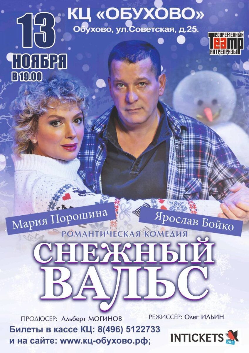 ✨ "Снежный вальс" в Обухово: Укутайтесь в тепло романтики и юмора! ✨ Только представьте: за окном кружит снежная буря, а в зале КЦ "Обухово" 13 ноября в 19:00 оживает история двух одиноких сердец! 💖 Приглашаем вас на романтическую комедию "Снежный вальс" по пьесе Питера Куилтера "Пленённые в снегу" с блистательными Марией Порошиной и Ярославом Бойко! 🌟 Позвольте себе вечер, наполненный смехом, теплом и надеждой! Наблюдайте, как на фоне зимней стихии зарождается робкое, но такое настоящее чувство между двумя совершенно разными людьми - Патриком и Джудит! "Они сошлись: вода и камень, стихи и проза, лёд и пламень"... И это еще не все! Только 3 дня у вас есть шанс приобрести билеты по специальным ценам от организаторов: • 2500 рублей - места во 2, 5 и 6 ряду (вместо 3000) • 2200 рублей - места в 10-11 ряду (вместо 2800) • 2000 рублей - места в 13, 14, 16 рядах (вместо 2600) • 1500 рублей - места на балконе (3 и 4 ряды, вместо 2000) Ознакомиться со схемой зала и выбрать лучшие м