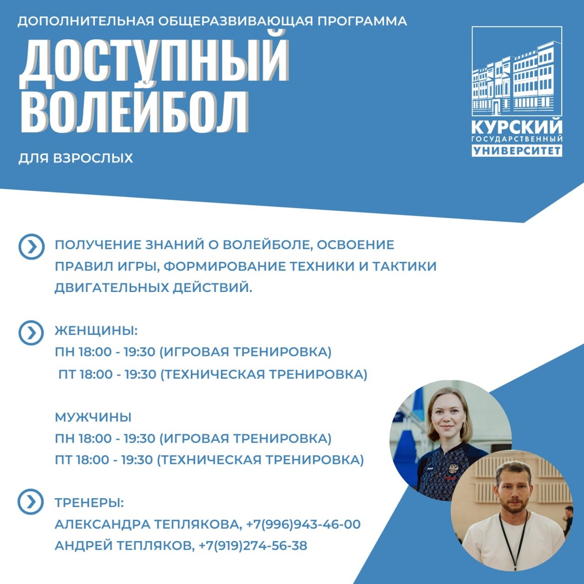 Доступный волейбол🏐 Ведется набор мужской и женской групп для занятий волейболом в рамках дополнительной общеразвивающей программы «Доступный волейбол» для взрослых в КГУ ЖЕНЩИНЫ: 📆 Пн: 18:00 - 19:30 - игровая тренировка 📆 Пт: 18:00 - 19:30 - техническая тренировка МУЖЧИНЫ 📆 Пн: 19:30 - 21:00 - игровая тренировка 📆 Пт: 19:30 - 21:00 - техническая тренировка 📆 СБ: 18:00 - 21:00 - общая игровая тренировка Занятия подойдут как для новичков и любителей, так и тех, кто уверенно чувствует себя на площадке. В ходе тренировок вы освоите базовые элементы владения мячом, научитесь взаимодействию в команде, улучшите физическую форму и координацию, усовершенствуете имеющиеся данные 👫 Индивидуальный подход тренеров к каждому позволит быстро адаптироваться и почувствовать себя частью команд вне зависимости от уровня технической и физической подготовки. 💬 Записаться на бесплатное пробное занятие и получить дополнительную информацию можно по ссылке Контактное лицо: Александра Теплякова,