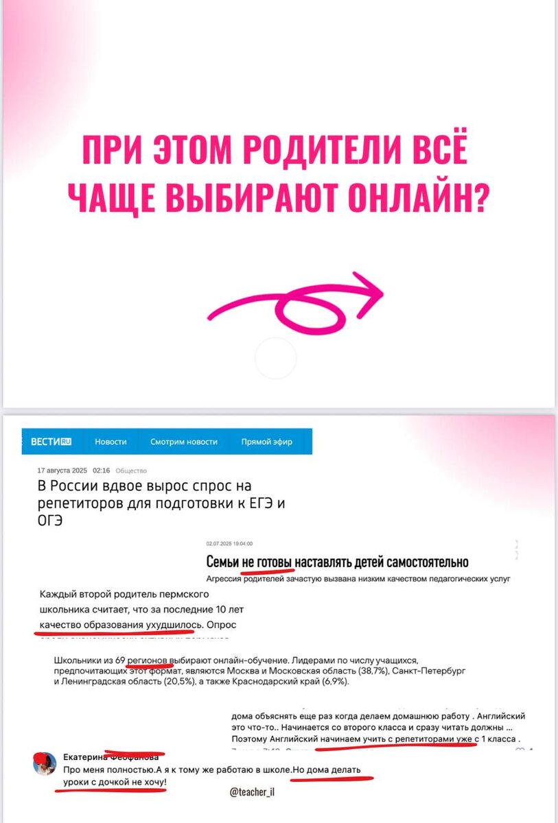 🎓 Почему опытные учителя до сих пор ставят цены “чтобы не отпугнуть”? Недавно мне написали: «Я работаю репетитором уже 6 лет. Никто не хочет онлайн, всем подавай офлайн.» Но если посмотреть на цифры, спрос на онлайн-занятия растёт. Родители выбирают дистанционное обучение, и всё чаще ищут не просто “учителя рядом”, а современного педагога, который владеет сервисами, нейросетями, умеет заинтересовать и делает уроки живыми. Парадокс в том, что многие опытные учителя ставят цену поменьше, “чтобы не отпугнуть”. И теряют учеников тем самым. А рынок занимают те, кто просто не боится заявить о себе. На эфире я как раз показала, какие ошибки мешают зарабатывать дороже и как перестать бояться онлайна. 🎥 Запись эфира доступна только до 19 октября. Смотрите, пока не закрыли: 👉 https://teacheril.online/video12.10