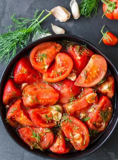 Все нужные продукты собраны. Теперь сам пошаговый рецепт быстрых маринованных помидоров. 1. Нарежьте кожицу помидоров крест-накрест. Затем положите все помидоры в большую миску и залейте кипятком. Оставьте их в воде на три минуты. Слейте воду. 2. Очистите помидоры о