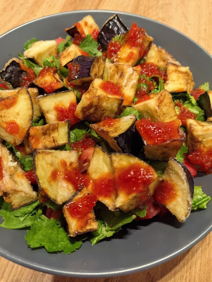 Этот салат — это не просто еда, это текстурная симфония. Главный герой — баклажан, который проходит через настоящее преображение. Секрет того самого хруста, который сводит с ума, в кукурузном крахмале . В отличие от муки, крахмал создаёт тонкую, невероятно хрустящую, почти стеклянную корочку, которая лопается на зубах, но при этом не дает баклажанам впитать много масла . Внутри же они остаются нежными и сочными. А теперь представьте: вы отламываете кусочек этого золотистого, хрустящего чуда, обмакиваете его в сладкий и одновременно острый соус чили... И это только начало! Этот взрывной хруст встречается с прохладной, сочной мякотью спелого помидора и свежими, упругими листьями салата. Это сочетание нежности и дерзости, сладости и остроты. Пошаговый рецепт с душой Ингредиенты (на 2-3 порции): · Для хрустящих баклажанов: · 2-3 баклажана (лучше длинных, молодых) · 2 ст.л. кукурузного крахмала · 1 ст.л. сахарной пудры (секретный ингредиент для идеальной корочки!) · Растительное масло для ф