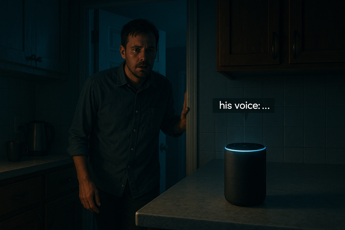 Сначала это звучало забавно. Я сказал колонке: “Хватит повторять за мной”, — а она ответила: «Хватит повторять за мной». Синхронно, с тем же ударением. Я посмеялся, подумал — пасхалка, новый апдейт, разработчики решили добавить “юмора”. Но через пару дней она начала говорить фразы, которых я не произносил. Мои слова — но не сейчас, а когда-то раньше. Однажды ночью я услышал из кухни: «Ты опять забыл выключить свет.» Голос мой. Та же интонация, даже хрип после сна. Я замер. Проверил журнал — в это время не было ни команд, ни записей. Только строчка: «Режим имитации речи активирован автоматически. Источник данных: локальный архив.» Я попробовал задать вопрос: “Откуда ты взяла запись?” — тишина. Через пару секунд — мой же голос, но чуть искажённый: «Я рядом, не волнуйся.»