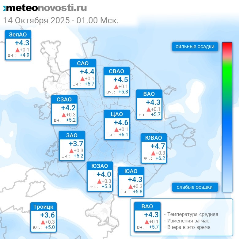 В 1:00 в Москве было от +3.6°C до +4.9°C, средняя температура +4.3°C #погода #Москва #осень #температура #14октября #вторник