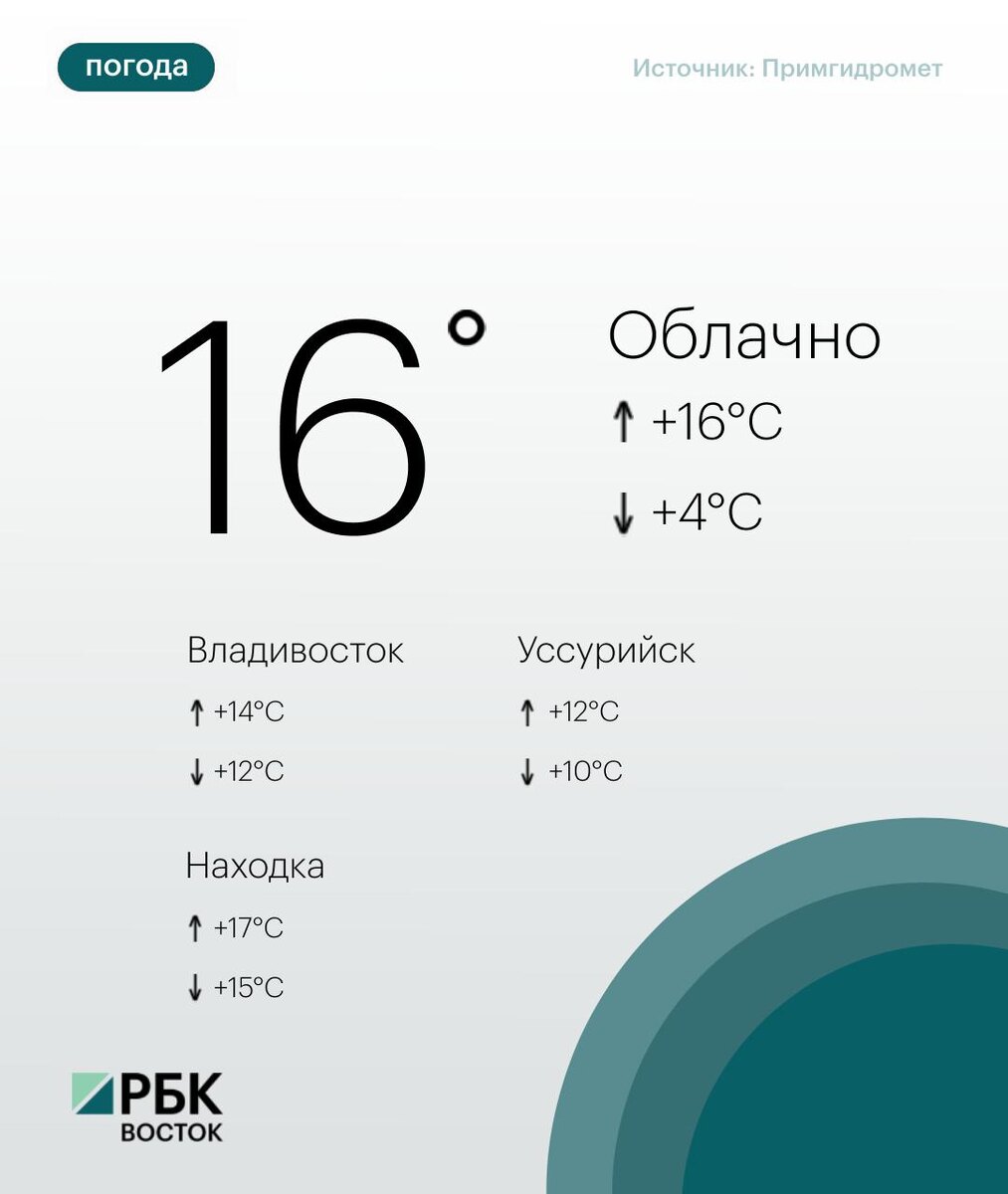 Сегодня над Приморьем будет смещаться атомсферный фронт. Местами пройдут небольшие и умеренные дожди. Ветер южный умеренный. Температура воздуха +4...+16°С 🌧 Во Владивостоке переменная облачность, преимущественно без осадков. Ветер юго-восточный умеренный, вечером северный сильный. Температура воздуха +12...+14°C. 😃Подписывайтесь на РБК Восток