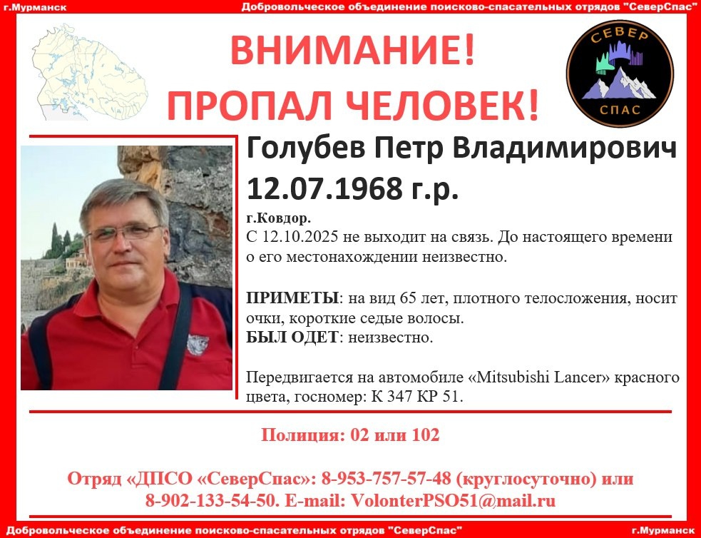 ⚡В Ковдоре ищут пропавшего мужчину В Ковдоре ведутся поиски 57-летнего Петра Голубева. Со вчерашнего дня, 12 октября, не выходит на связь с близкими. До настоящего времени его местонахождение неизвестно. Передвигается на автомобиле «Mitsubishi Lancer» красного цвета, госномер: К 347 КР 51. Фото: ДО ПСО «СеверСпас»