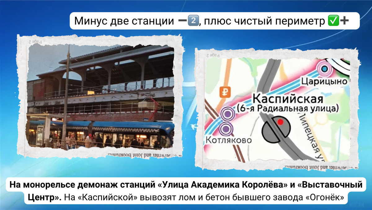 официальные отчеты. Давайте вместе разберемся, что же на самом деле происходит с нашей Москвой. Поехали? Во-первых, покажем демонтаж инфраструктуры на бывших станциях «Улица Академика Королёва», «Выставочный Центр» 🚝 Московского монорельса. Продолжается вывоз строительного мусора после сноса строений завода «Огонек», попавших в зону строительства 🚇 станции «Каспийская» 🏭 Бирюлëвской линии. ----------------------------------------------------------------------------------- Ну вот, друзья, мы и