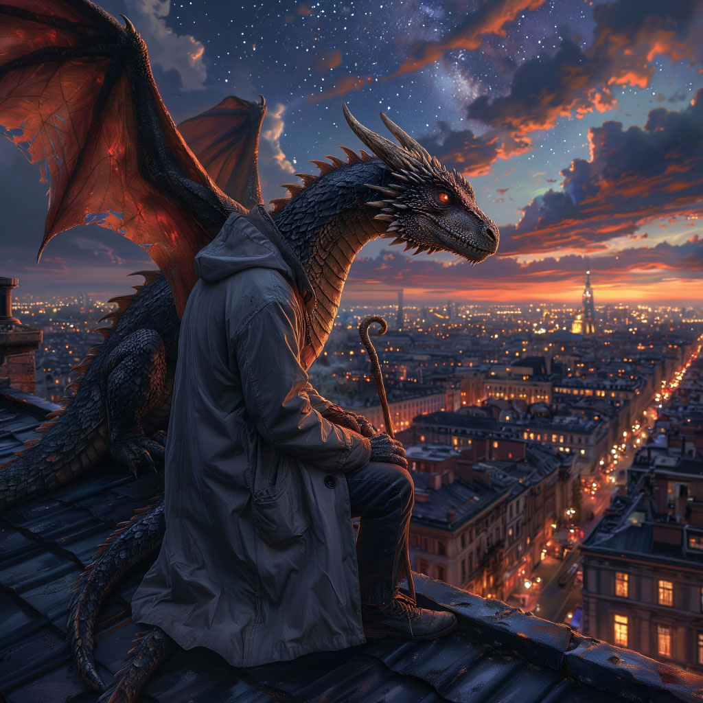 В тот вечер небо было особенно прозрачным — таким, что казалось, можно дотянуться рукой до звёзд. Я сидел на краю крыши, наблюдая, как город внизу растворяется в сумерках, словно сахар в горячем чае. Дракон пришёл ко мне в образе старого знакомого — в сером плаще, с тростью, отбрасывающей причудливые тени на мокрый асфальт. Его глаза светились внутренним огнём, который не мог скрыть никакой человеческий облик. — Знаешь, — сказал он, присаживаясь рядом, — иногда я жалею, что мы не можем просто жить. Без всех этих миссий, предназначений и вечных битв. Я молчал, глядя, как последние лучи солнца окрашивают облака в цвет расплавленного золота. — Люди думают, что драконы — это воплощение силы и власти, — продолжал он, — но они не знают, как это — нести на себе тяжесть веков, помнить всё, что было, и знать всё, что будет. Ветер принёс запах дождя. Где-то вдалеке грохотал гром, словно кто-то там, наверху, переставлял гигантские шахматные фигуры. — А ты когда-нибудь хотел просто быть? — спроси