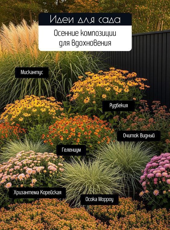 Осенняя симфония: Идеи для сада, что пленят сердце Когда лето, устав от собственной пышности, уступает место прохладе, в саду наступает самый волнующий и философский сезон — осень. Это не время увядания, а время торжества зрелой красоты, богатых красок и изящных форм. Давайте вместе создадим осеннюю композицию, которая будет не просто радовать глаз, а станет настоящим источником вдохновения, маленькой вселенной в вашем саду. Представьте себе картину, где каждый элемент ведет свою партию в общей гармоничной симфонии: 🎶 Мискантус — Маэстро Ритма и Света Этот величественный злак — дирижер вашей осенней композиции. Его высокие, упругие стебли и пушистые метелки, переливающиеся на низком осеннем солце от серебристо-розового до золотистого, задают всей клумбе вертикальный ритм и движение. Даже в штиль мискантус будто бы шепчет ветру, а его шелковистые султаны ловят каждый луч света, создавая магическое свечение. Он — фон и одновременно главный солист, архитектор структуры вашего сада.