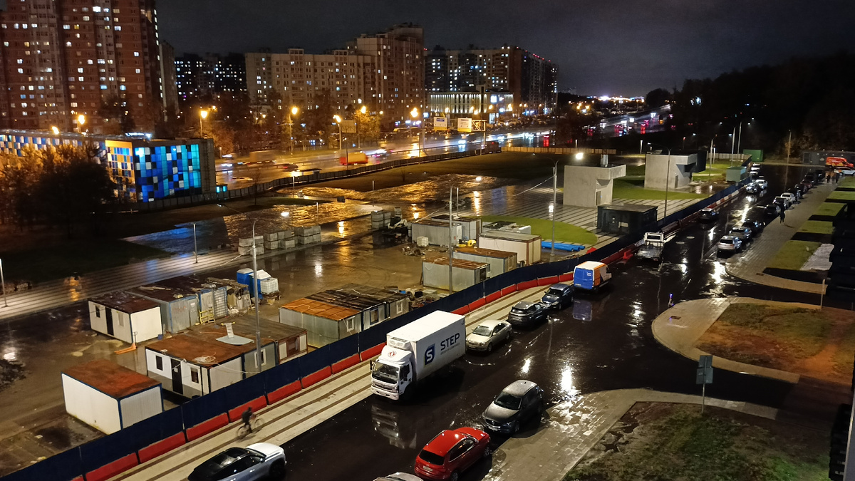 Стройку заливает дождём, все работы остановлены, но вывозятся бытовки, их всё меньше и меньше. А я всё ещё мучаю режимы нового телефона, проверяя ночные фото, всё никак не могу привыкнуть после четырёх с половиной лет юзанья гнусмас-м21. Так что вот на ваш суд пара фоток... Скажите, какая лучше? Первая сделана в обычном режиме 16:9 с ИИ. Вторая в режиме UltraNight, то есть при максимально раскрытой для ночи диафрагме камеры. Не могу понять, что в итоге информативнее и понятнее, а что красивее с точки зрения красок и картинки в целом. Жду от вас личных мнений в каменты. Да, и если кому интересно, то работ на площадке осталось всего ничего. На фото ниже: убрать все заборы, построить лестницу к автобусной остановке (где стрелка), уложить плитку (в выделенном многоугольнике) и вывезти бытовки и заасфальтировать под ними будущую парковку вторым слоем. Всё! Продолжаю наблюдение и жду каменты. За сим вечно ваш (с) Касым, 2025