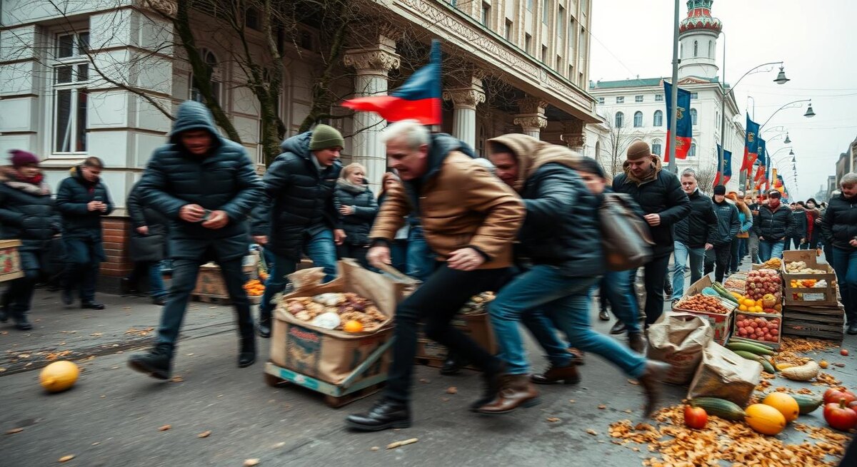 Эпицентр конфликта развернулся за считанные минуты. Когда активисты попросили убрать испорченный товар и показали камере чёрные пятна на абрикосах и мягкие, вдавленные помидоры, один из продавцов резко оттолкнул руку с телефоном. По словам очевидцев, последовали крики на смешанном языке, попытка закрыть объектив картонной коробкой, кто‑то рванулся к пакету с грушами и швырнул его на землю, расплескав липкий сок. «Выключи! Нельзя снимать!» — звучало снова и снова. Один из активистов получил удар плечом, у другого сорвали маску с лица. Вокруг — растерянные покупатели: одни отступают, другие достают свои смартфоны. Женщина с коляской торопливо обходит эту свалку, подростки нервно хихикают, но продолжают снимать, а мужчина среднего возраста пытается разнять стороны, повторяя: «Спокойно, спокойнее, сейчас полиция приедет». В воздухе — резкий запах перегнивших фруктов, под ногами — хлюпающая кожура. Шум привлекает ещё людей, кто‑то кричит: «Нам не нужен базар на тротуаре!»