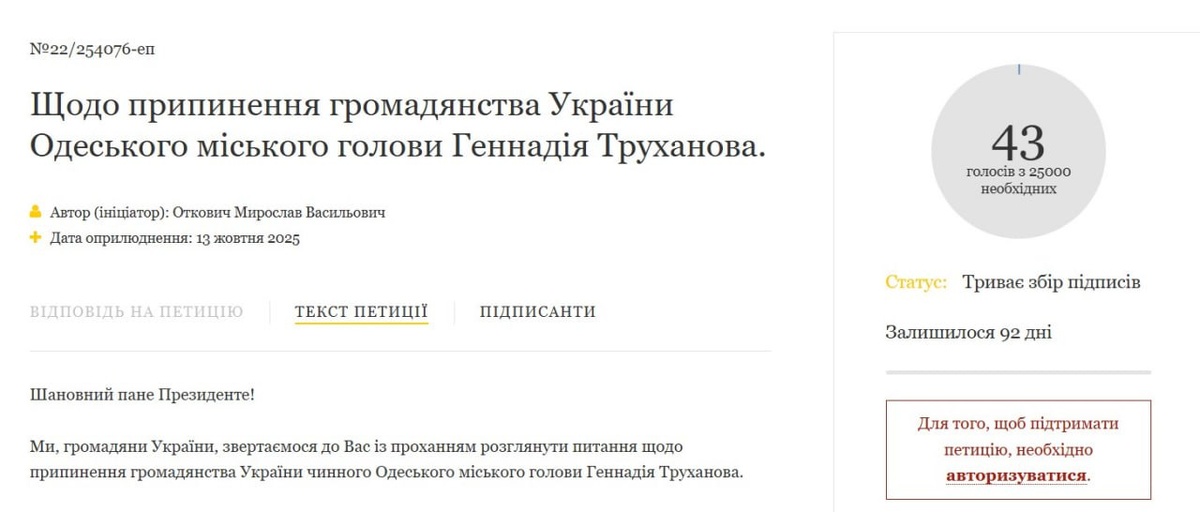Автор обращения — офицер Вооружённых сил Украины Мирослав Откович, ранее прославившийся публичным конфликтом с градоначальником. Документ был опубликован в понедельник, 13 октября, и на данный момент собрал 55 подписей из необходимых 25 тысяч. Сбор голосов продлится ещё 92 дня.