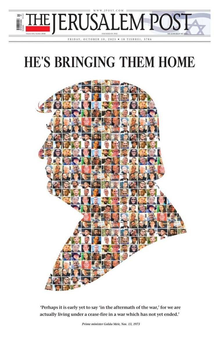 Израильская газета Jerusalem Post тоже представила новую обложку — коллаж из фото израильских заложников, образующий силуэт Трампа.