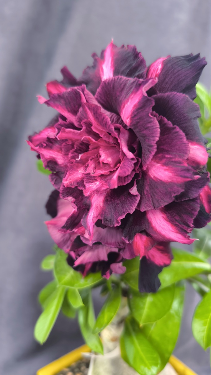 Сделала я его в этом году , привила на свой взрослый сеянец черенки сорта Yu Jiao (в простонародье просто Дракон). Этот сорт один из самых известных темно цветковых сортов. Великолепной расцветки. Очень трудно фотографируемый цвет, темный с бордово- фиолетовый. Первые цветы выдает всегда крупные и очень сильно махровые. В этот раз рядов всего пять я насчитала. Зимой выдавал цветы с 7 рядами на меньшем подвое. В связи с этим имеет особенность закручивать лепестки внутренних рядов в мятый кочан, что мешает им потом раскрываться. Крупные цветы Yu Jiao тяжёлые и поникают, но сорт на крупном подвое довольно охотно у меня даёт бутоны, не всегда правда все доживают до открытия, в моих кривых рученках. На промо фото от тайских производителей, как за частую бывает он выглядит не лучшим образом. При это так регулярно бывает что сорт в живую выглядит лучше чем на фотографии зарубежных продавцов. Официально сорт считается триплом(с тремя рядами лепестков). Но я пока цветов с радостью меньше пяти н