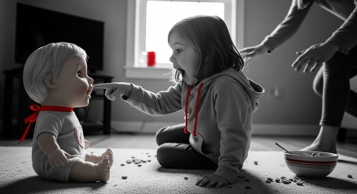 Потом из меня вырвался хриплый, первобытный крик — чистый материнский ужас. Я рванулась вперёд, не думая — только действуя. Ладонью нащупала на жёсткой пластиковой спине куклы утопленный переключатель.