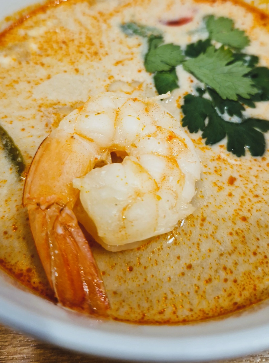 В основном в азиатских странах, например, в Таиланде или Вьетнаме готовят суп Том Ям Кунг. В нем из морепродуктов в основном креветки, не кокосового молока. Я люблю готовить Том Ям Нам Кхон, в котором ингредиентов больше и, на мой вкус, он интереснее. Если не хотите сильно острый суп, то не добавляйте шрирачу и поменьше чили.