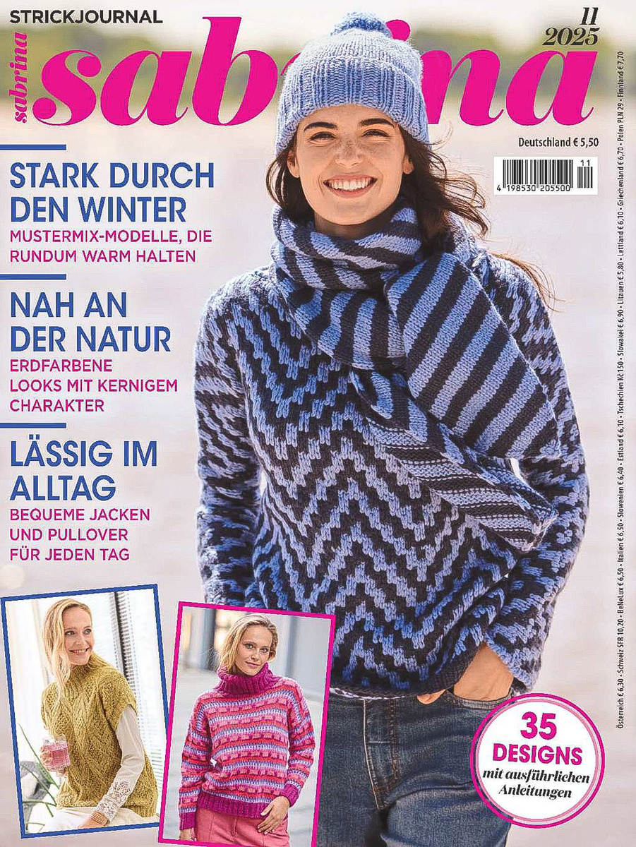 Свежая ноябрьская Сабрина 11/2025 пока ещё не дошла до прилавков наших магазинов, но немецкая онлайн-версия уже доступна — и, конечно, я не удержалась, пролистала её от первой до последней страницы. И, как это в последнее время особенно часто бывает, впечатления неоднозначные. Всего на страничках 35 моделей — вроде бы немало, но особого вдохновения не случилось. Скажем так: связать, конечно, есть что. Но нет ничего такого, что заставило бы бросить всё и начать вязать прямо сейчас. Номер неплохой, но без искринки. Такое ощущение, будто редакция снова решила сыграть по проверенным правилам: классика, немного текстуры, пара попыток добавить что-то современное — и всё. В итоге получился очередной номер без изысков. Главное ощущение после пролистывания — де-жа-вю, не устану повторять это слово от разбора к разбору. Многие модели до боли знакомые: да, немного иной цвет, другой ворот, новая пряжа — а форма и идея остались теми же. Хотя визуально номер получился очень приятным. Осенний, тёп