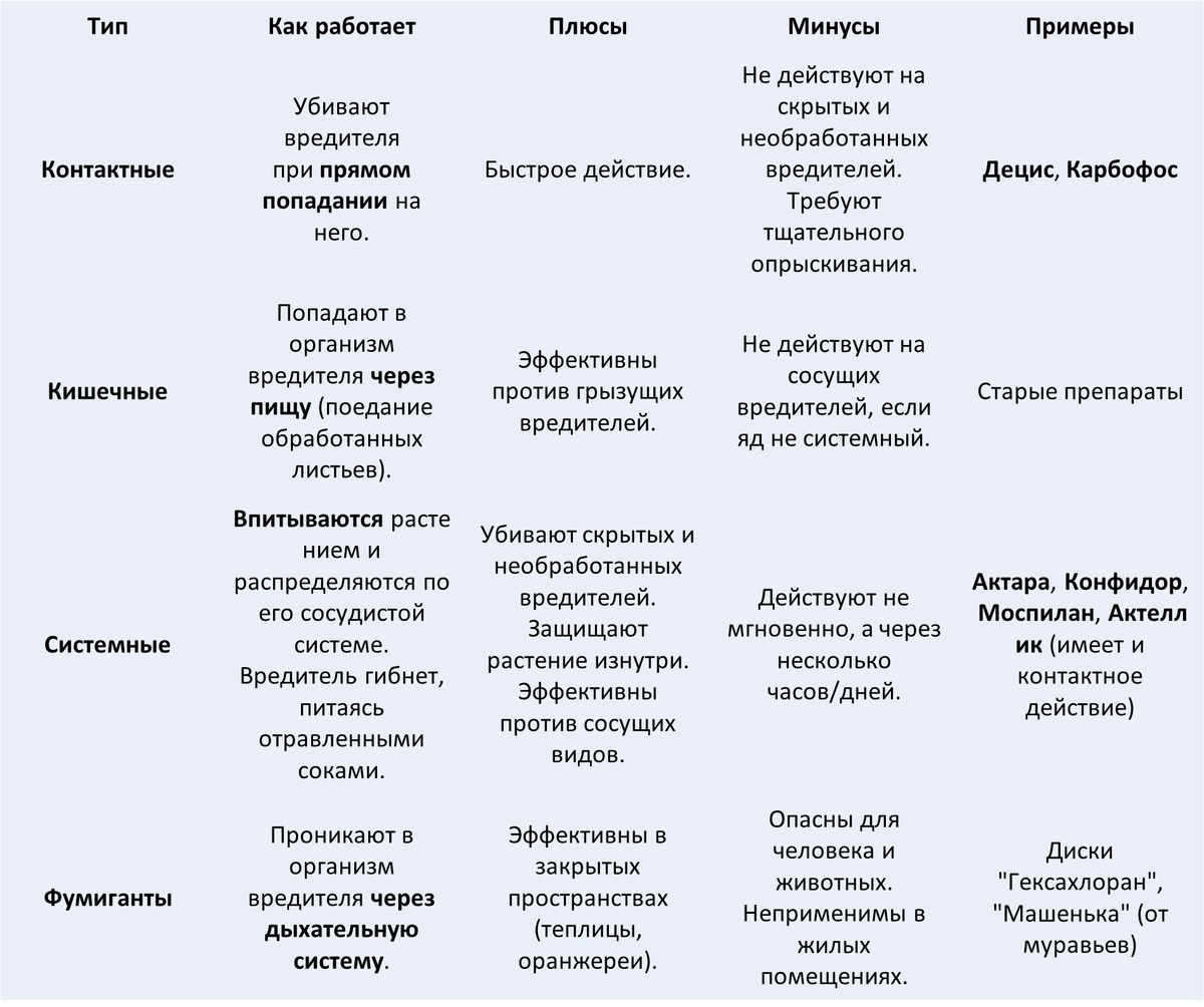 Предназначение: Для борьбы с насекомыми-вредителями (тля, щитовка, червец, трипсы, белокрылка, грибные комарики). Классификация по способу проникновения (принципу действия): Предназначение: Специализированные препараты для борьбы с паутинными, плоскотелками и другими видами клещей. Почему инсектициды не работают на клещей? Клещи — это не насекомые, а паукообразные. Их физиология иная, поэтому большинство инсектицидов на них не действуют. Классификация акарицидов: ❗ Главная проблема в борьбе с клещами: Они фантастически быстро вырабатывают резистентность (устойчивость) к ядам. Стратегия: Препараты необходимо чередовать из разных химических групп (например, сначала применить Санмайт, а при следующей обработке — Аполло или Оберон). Предназначение: Для профилактики и лечения грибковых и бактериальных заболеваний (гнили, мучнистая роса, пятнистости, фитофтороз). Классификация по принципу действия: