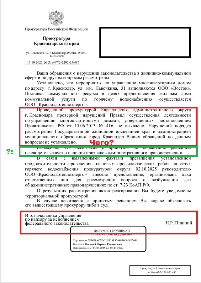 12 октября 2025 года мною получен ответ от и.о. начальника управления по надзору за исполнением федерального законодательства прокуратуры Краснодарского края Пшипий Н.Р. от 13.10.2025 № Отв-07/2-2205-25/485, который не только является формальной отпиской, но и содержит грубейшие нарушения закона, узаконивая системные бездействие и превышение полномочий в органах прокуратуры г. Краснодара.