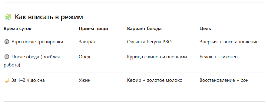 Все блюда — простые, с правильным балансом белков, углеводов и жиров, направлены на восстановление мышц, восполнение гликогена и электролитов. Идеально: после утреннего кросса или интервальной работы