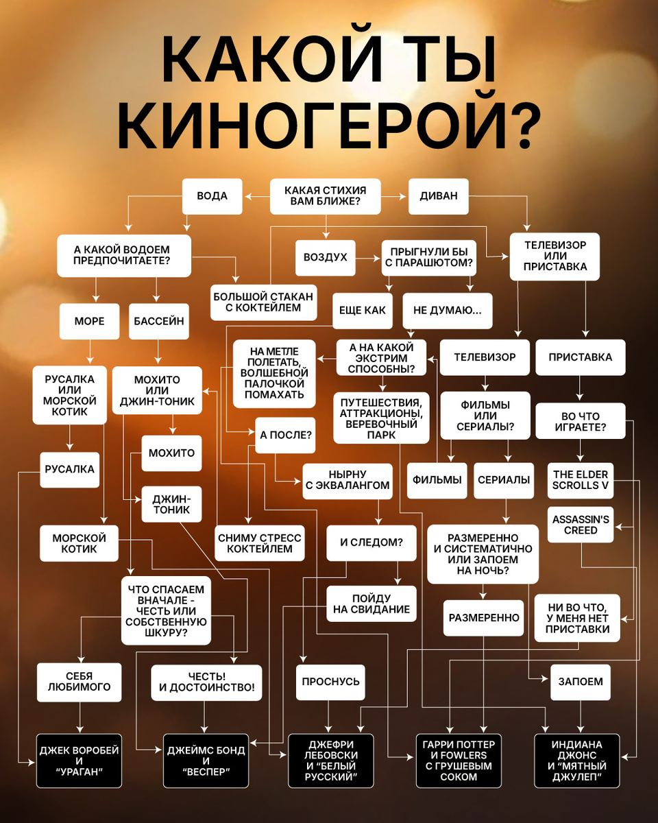 Предлагаем пройти шуточный тест и найти свое альтер-эго — киногероя, на которого вы могли бы быть похожи характером, привычками или предпочтениями. Джек Воробей — харизматичный и задорный Любитель приключений и интриган, в одну минуту смелый и бесстрашный, а в другую — паникер и трус. Один из самых ярких и любимых образов кинематографа. Джек и ром — почти неразлучны, а уж если к рому добавить тропических акцентов, получится совершенно крышесносный коктейль! Ураган Ингредиенты: Светлый ром Cool Skeleton — 60 мл Темный ром Armator gold — 60 мл Сок лайма — 30 мл Апельсиновый сок — 30 мл Сок маракуйи — 60 мл Сахарный сироп — 15 мл Гренадин — 15 мл Лед Приготовление: Смешиваем все ингредиенты в шейкере, добавляем лед, еще раз взбалтываем, процеживаем через сито в бокал, наполненный льдом. Джеффри Лебовски — смесь спокойствия и сарказма Невозмутимый и равнодушный, домосед и совсем немного — авантюрист. Созерцая и принимая тот хаос, который творится вокруг, Джеффри (Чувак) стал символом, геро