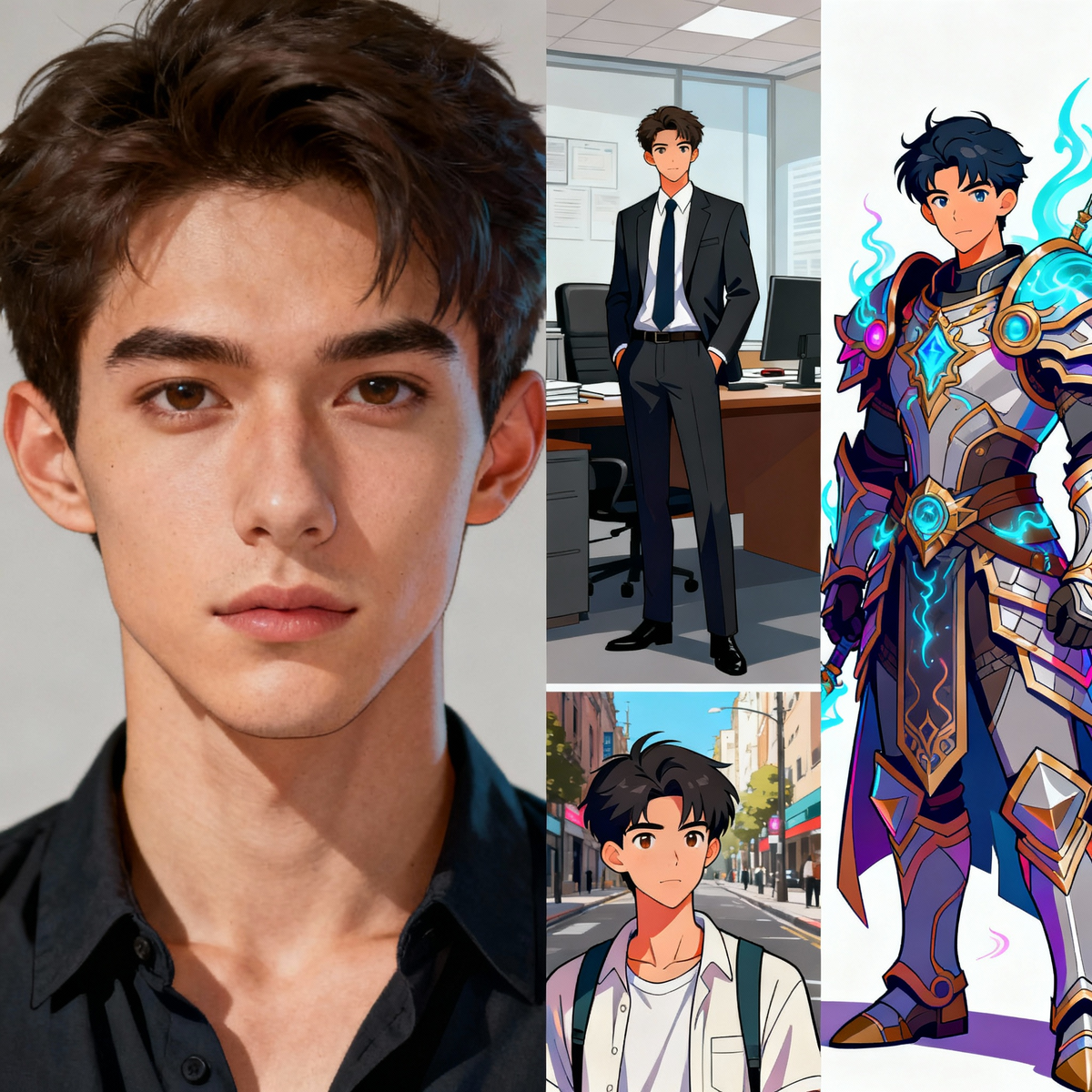 Результат: персонаж узнаваем на 95%. Лицо, пропорции, ключевые черты сохранены. Меняется окружение, одежда, освещение, стиль рисовки — но герой остаётся тем же. Можно сгенерировать десятки сцен за час: персонаж в офисе, на улице, в космосе, в средневековье, в стиле Pixar, в стиле аниме, в стиле комикса — везде это будет один и тот же узнаваемый человек.