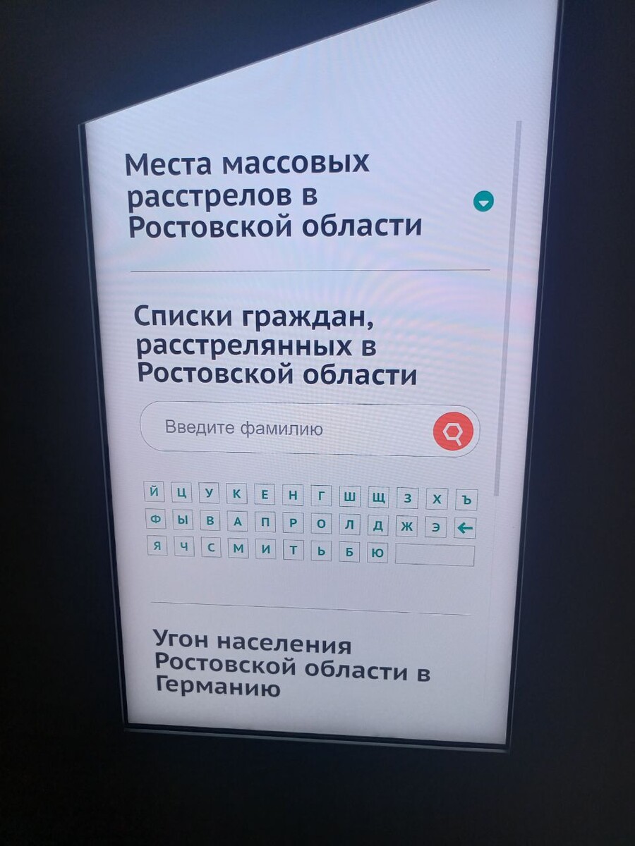 Дрожь и замирание в сердце вызывает экспозиция о концлагерях, расстрелянных и угнанных жителях Ростовской области . Любой желающий , может ввести информацию в компьютер и узнать судьбу своего родственника.
