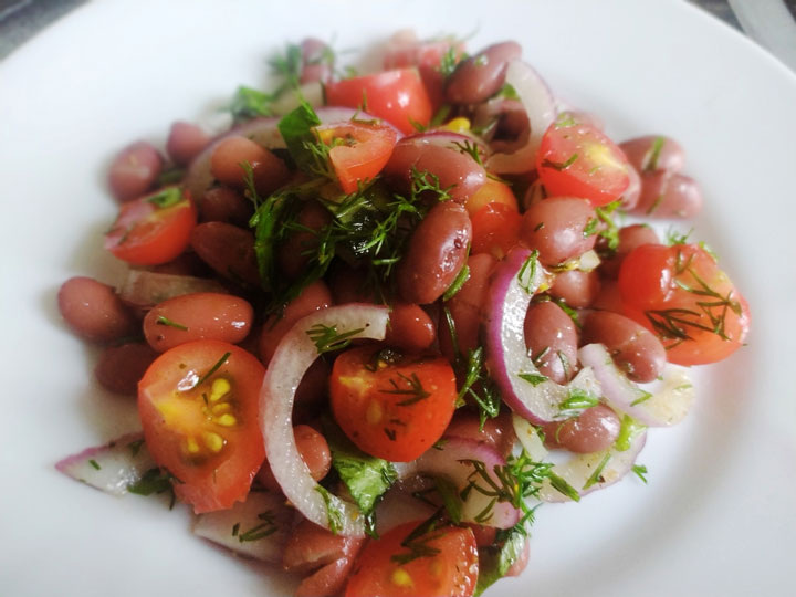 Предлагаю вариант белкового салата. Просто и вкусно. Итак, осталась отварная фасоль, неполный стакан. Горсть помидорок-черри. Нарезал четвертинками. Несколько веточек укропа, листья сельдерея порубил ножом. Красный Ялтинский лук нарезал полукольцами. Все ингредиенты смешал в миске. Соль, свежемолотый перец, растительное масло. Лимонный сок- факультативно. КБЖУ на 100 г - 85/4,3/3,6/9,5. Рецепт на странице Автор рецепта – Елена Некрасова Автор рецепта – Юрий Колосов Расчёт КБЖУ сделан с помощью Telegram-чат-бота https://t.me/vesipitaniebot © Почтенный возраст Online и Рецепты для диабетиков