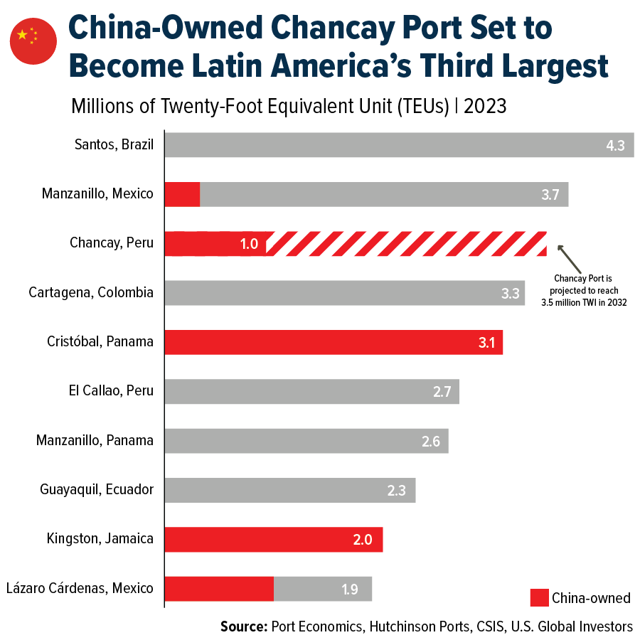 В ноябре прошлого года председатель КНР Си Цзиньпин посетил Перу, где перерезал ленточку на открытии глубоководного порта Чанкай стоимостью $1,3 млрд. Чанкай - первый «умный порт» в Южной Америке, обладающий сетью автомобильных и железных дорог, кабелей передачи данных и электросетей. Он был построен китайским государственным судоходным гигантом COSCO, который также управляет этим портом.