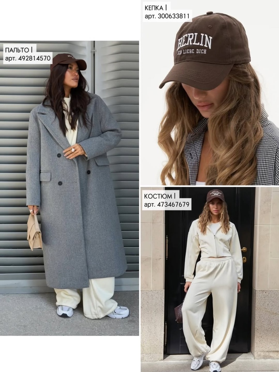 В этой подборке — вещи, которые легко складываются в полноценный сезонный гардероб. Серое пальто и молочный костюм создают расслабленный городской образ; графитовые джинсы, серое худи и тёплые кроссовки — идеальны для активного дня; бордовый комплект из пальто, сапог и перчаток — выбор для выразительных выходов; серый свитшот, чёрные сапоги и серая сумка — спокойная база; коричневое пальто, шоколадные сапоги и мини-юбка — женственный акцент на осень.